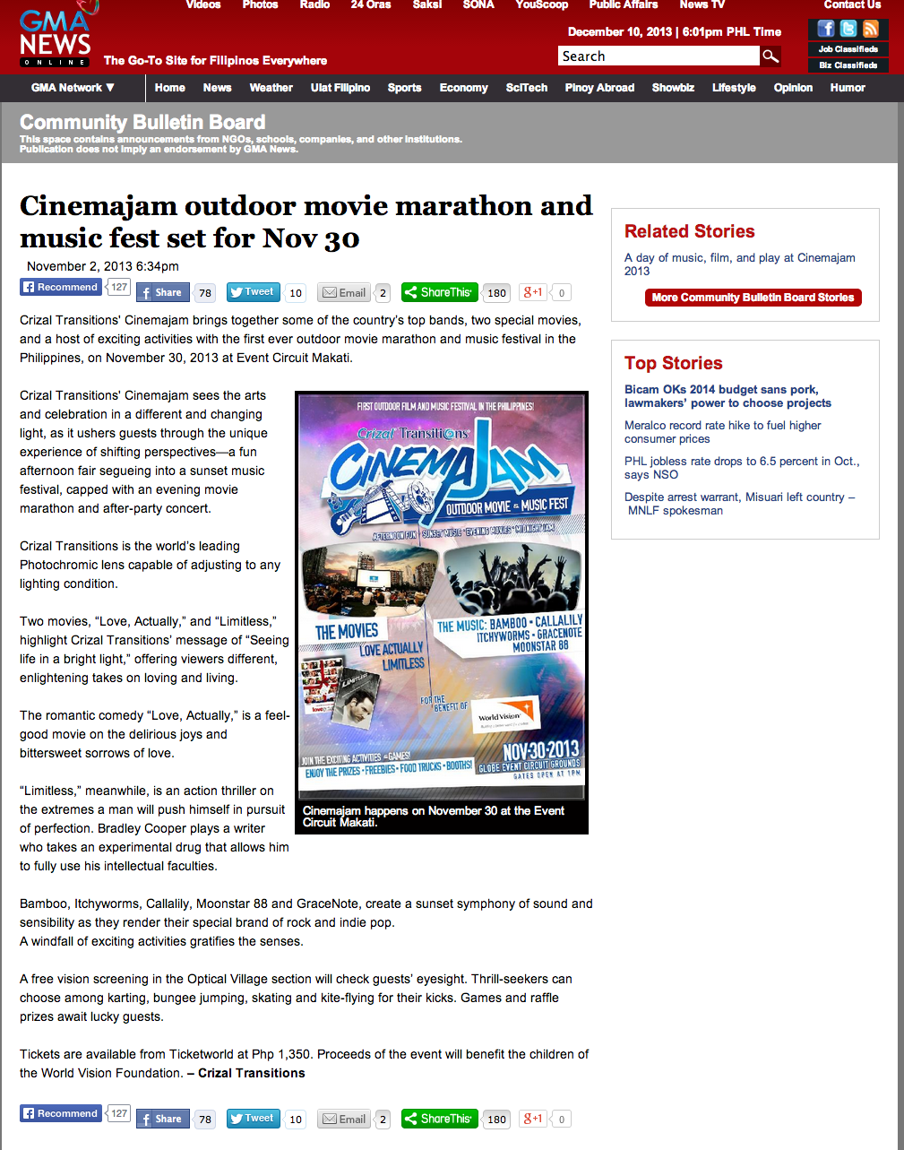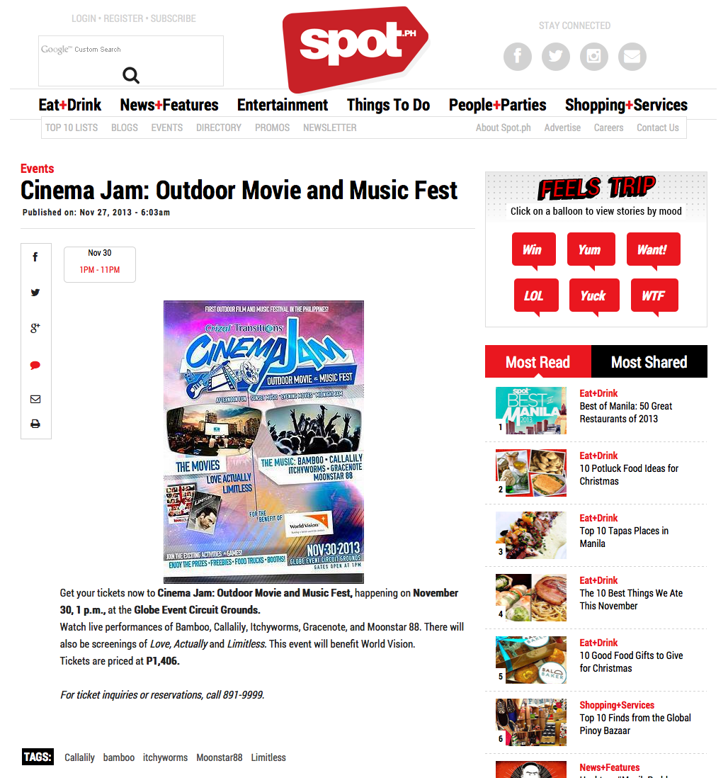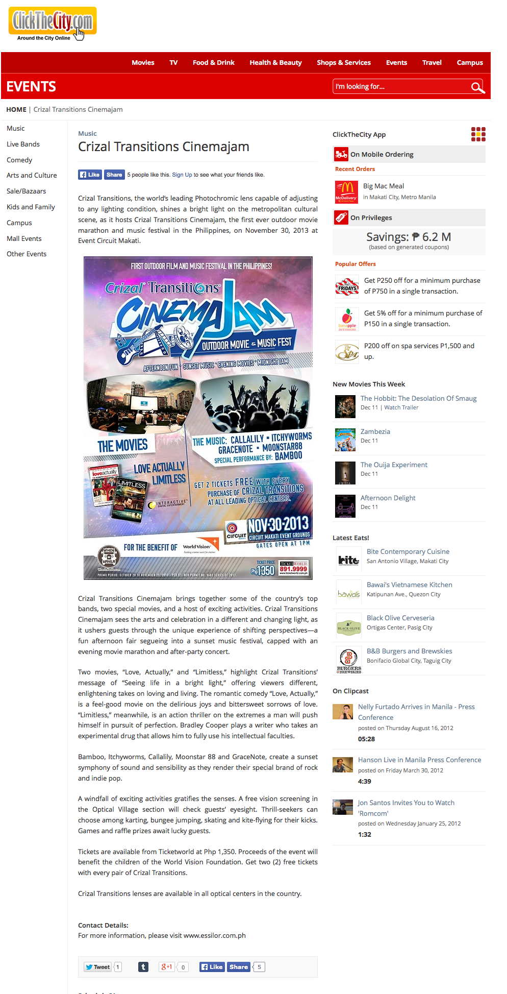 To promote the newest Crizal transition lenses, Centaur worked with client, Essilor, to produce the country’s first outdoor movie & music event. Cinema Jam was the first event held at Circuit Makati and featured outdoor activities (skateboarding, trampoline, wall climbing, etc.) along with great music by local bands Bamboo, Callalily, ItchyWorms, Gracenote & Moonstar88.